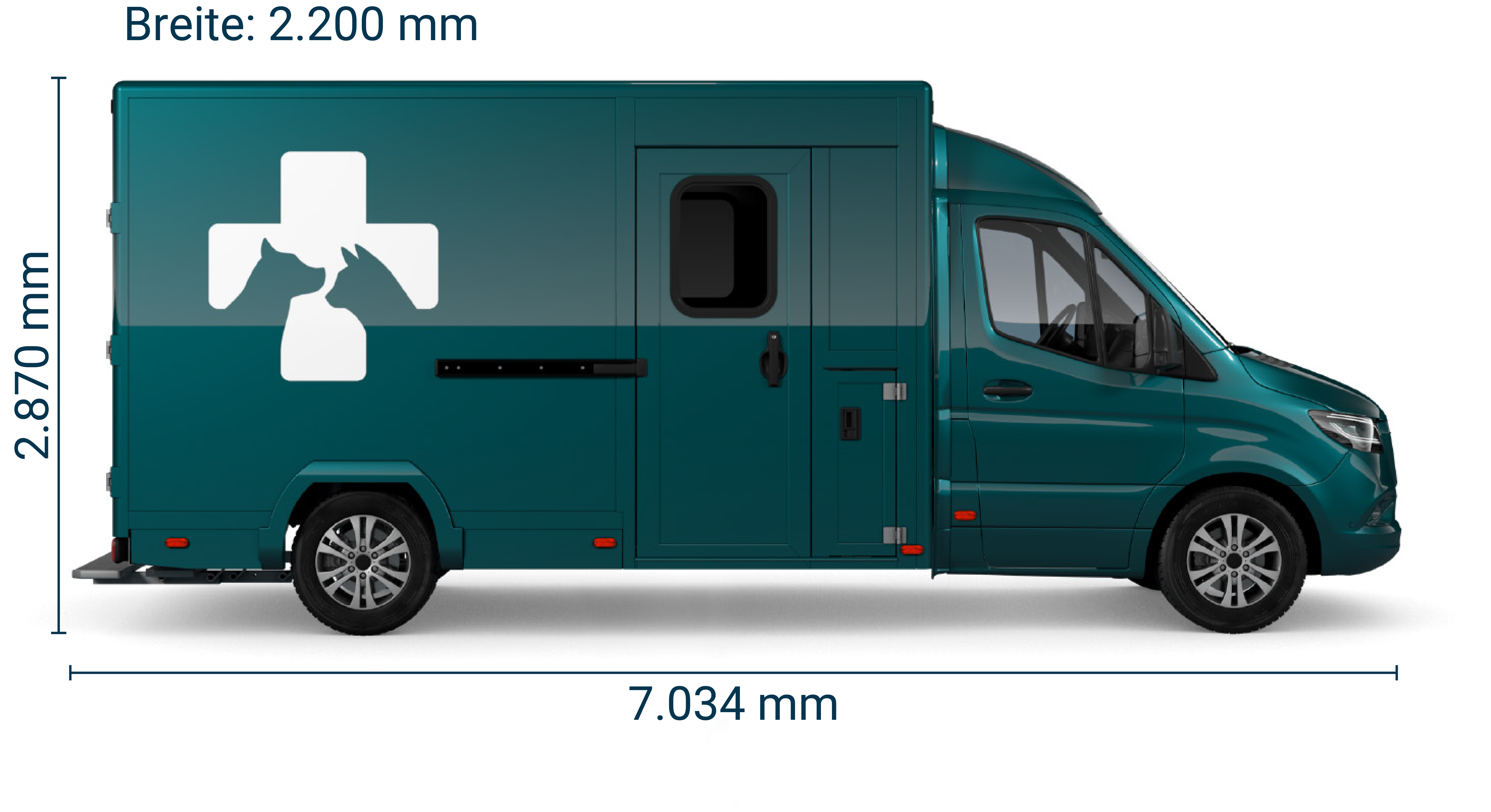 Dank Klimaanlage und Heizung kann das Fahrzeug wetter- und jahreszeitenunabhängig eingesetzt werden. Zudem ist es mit einem Hygienebereich, einem leistungsfähigen Elektropaket sowie LED-Beleuchtung ausgestattet. Seiten- und Dachfenster sorgen zudem für Tageslicht im Fahrzeug, eine seitliche Schiebetür und ein Heckportal bieten ideale Voraussetzungen zur Behandlung von Kleintieren und Pferden.